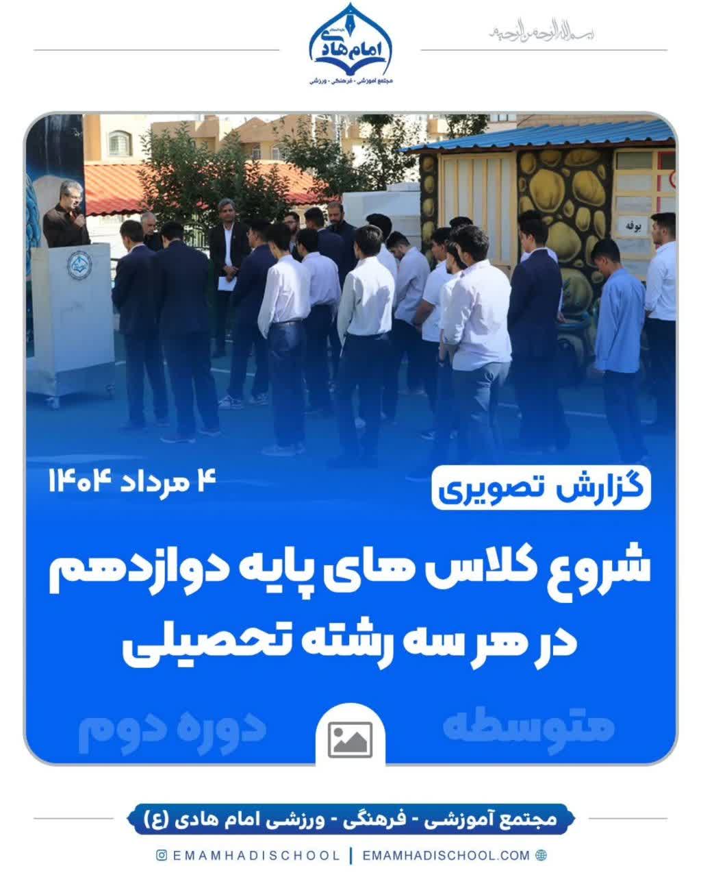 با یاری خداوند، کلاسهای پایه دوازدهم در هر سه رشته تحصیلی از ۴ مرداد ۱۴۰۴، به طور رسمی آغاز شد. دانشآموزان با انگیزه و تلاش مضاعف پا به سالی گذاشتند که سرنوشتسازترین مرحله تحصیلیشان است. برای همه عزیزان آرزوی موفقیت، رشد و سربلندی داریم