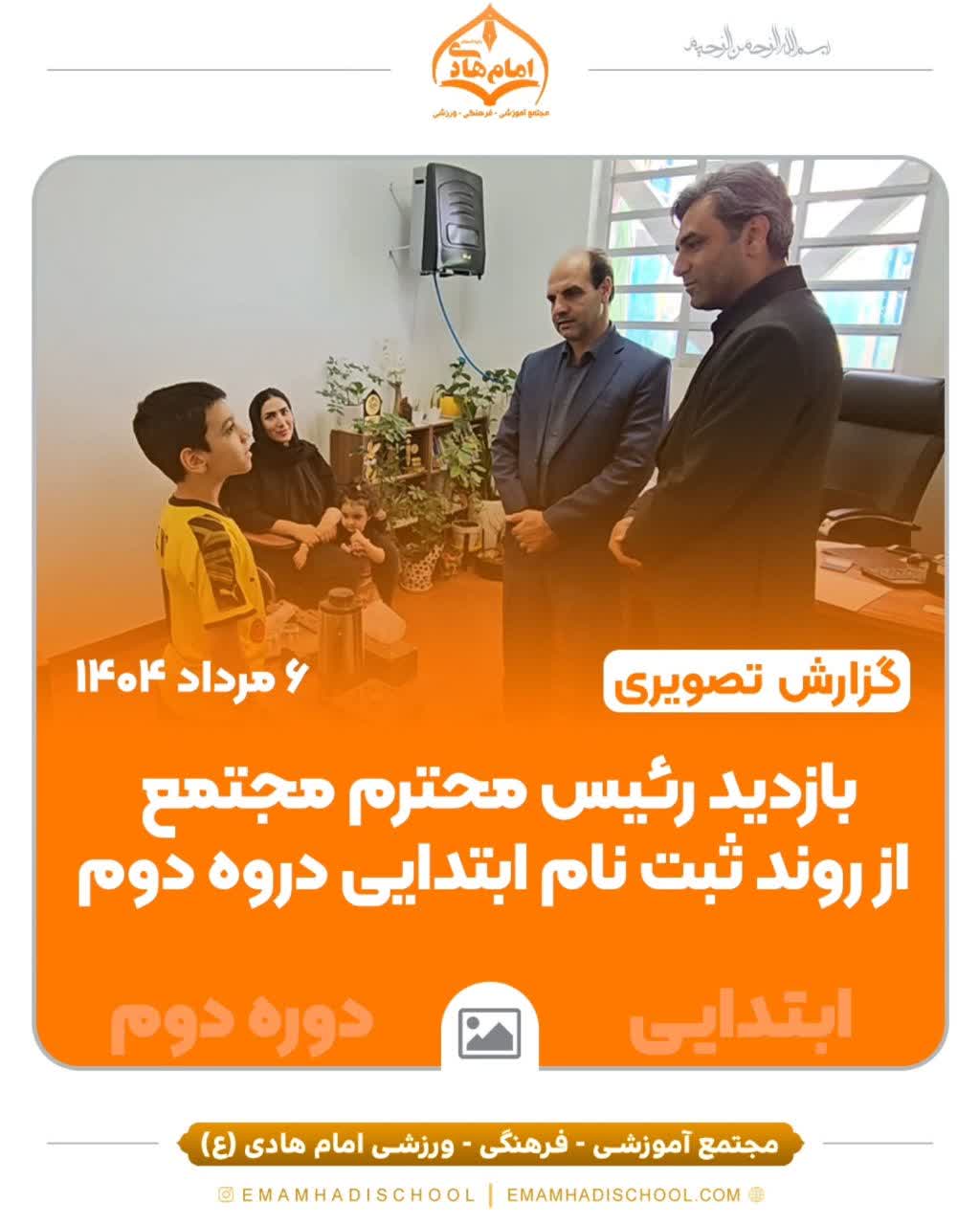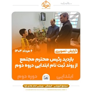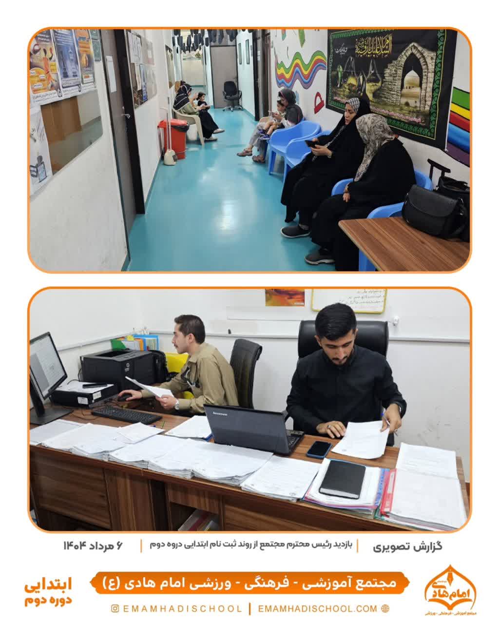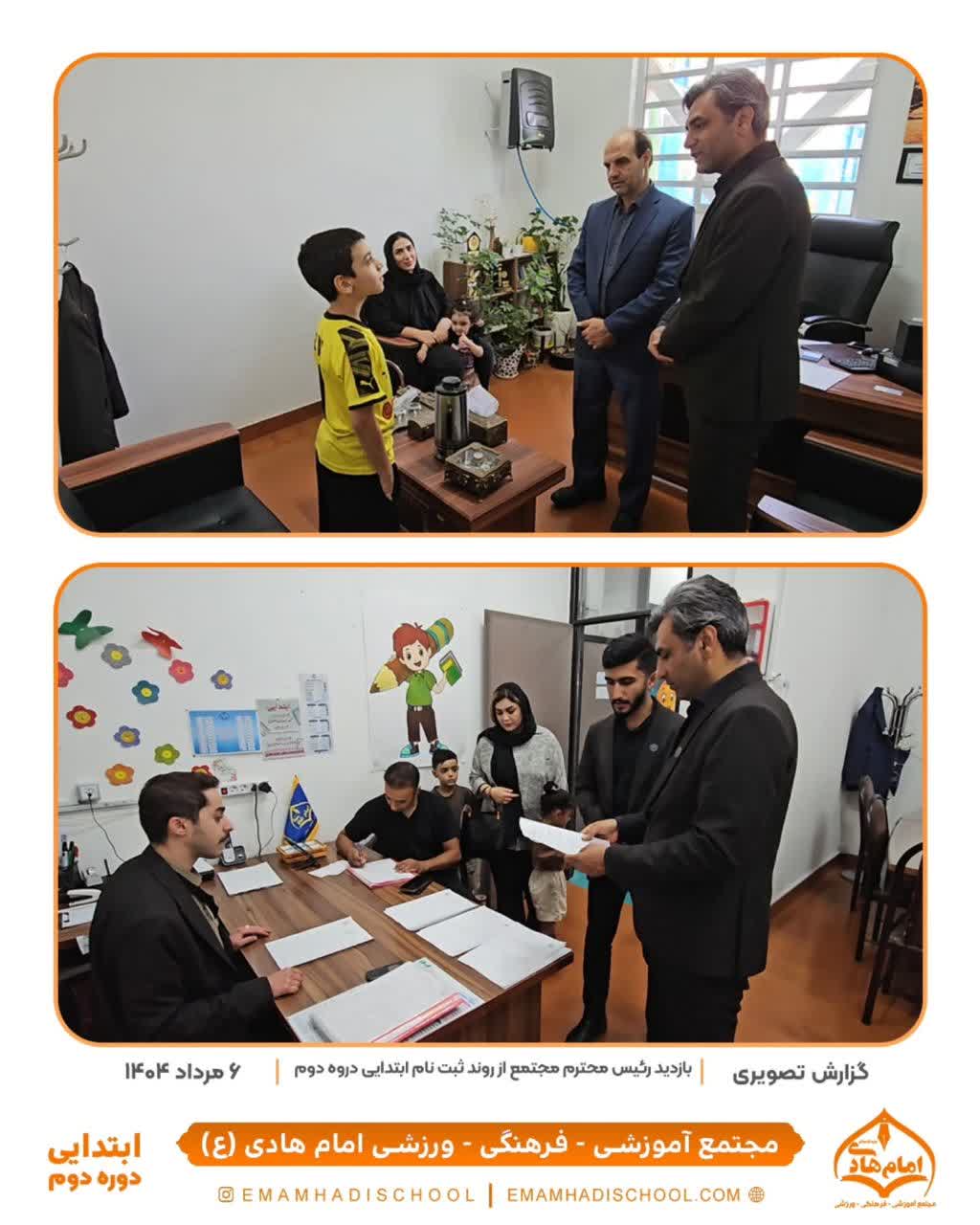 بازدید رئیس محترم مجتمع از روند ثبت نام ابتدایی دوره دوم ۶ مرداد ۱۴۰۴ در این بازدید، رئیس محترم مجتمع در جریان روند اجرایی ثبت نام دانش آموزان ابتدایی دوره دوم قرار گرفتند و با خانواده ها و عوامل اجرایی گفتگو کردند.